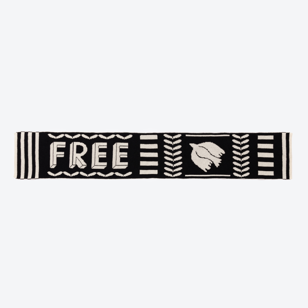 Our beautiful reversible wool scarf in monochrome black and white, the traditional keffiyeh scarf colours, features a dove for peace, olive leaves for perseverance, strength and resilience and bold lines representing historical trading roots.