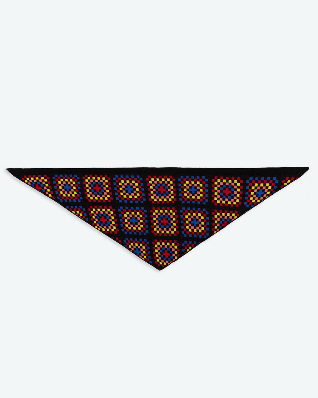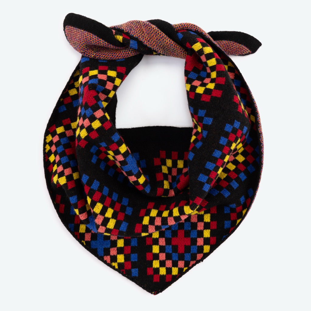 Brighten grey days with the Granny Squares Wool Triangle Scarf. Featuring bold crochet-inspired blocks of red, yellow, pink, and blue on a black base, it’s colourful, cosy, and full of retro charm.